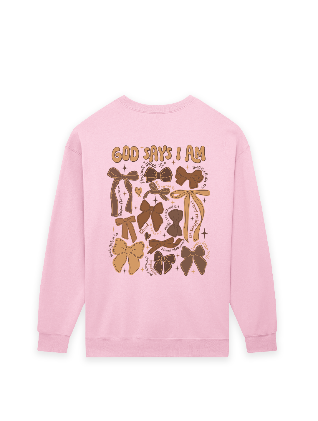 Our God Says I Am sweatshirt is printed on the cozy Gildan 18000 in soft pastel pink, featuring a beautiful front and back design filled with Scripture declarations of identity, worth, and truth.